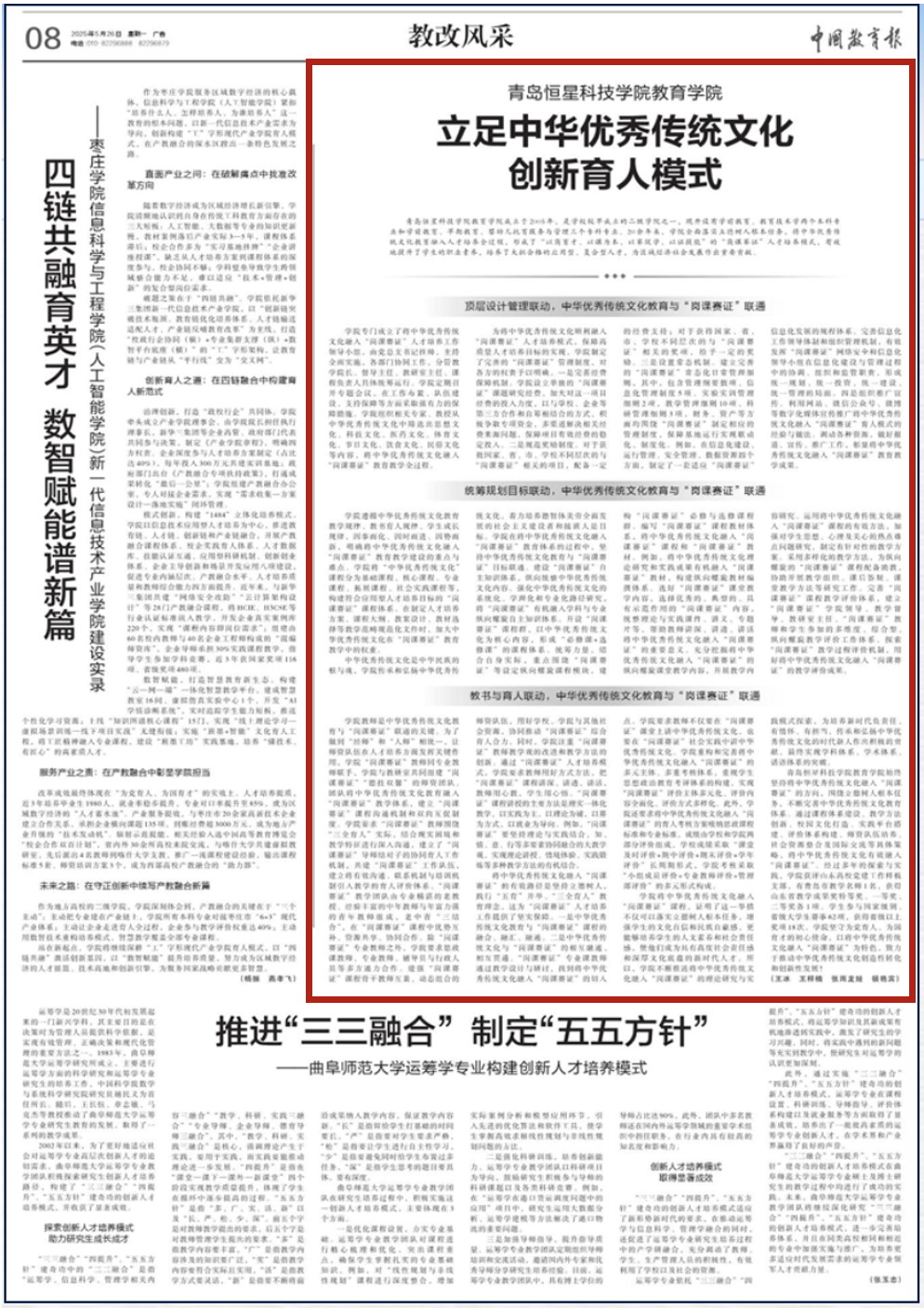 近日,《中国教育报》报道我院“青岛恒星科技学院教育学院:立足中华优秀传统文化创新育人模式”,点赞我院将中华优秀传统文化教育融入人才培养全过程,形成了“以岗育才、以课为本、以赛促学、以证提能”的“岗课赛证”人才培养模式,推动中华优秀传统文化创造性转化和创新性发展!