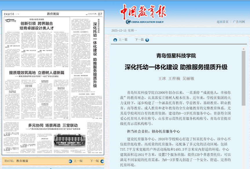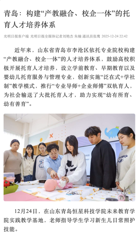 青岛恒星科技学院自2000年创办以来,一直秉持“成就他人,幸福你我”的教育理念,为社会培养了18万优秀的大学生。近年来,学校在集团的打力支持下,逐步构建了一个涵盖托育教育、学前教育、基础教育、职业教育、高等教育、成人教育和老年教育的全生命链教育的完整教育体系。尤其是学校利用自有的教育资源,建设的0-3岁托育服务中心,2024年4月获得了全国总工会、国家卫生健康委员会联合授予的100家2023年全国爱心托育用人单位称号、2022年1月获得了山东省卫生健康委员会授予的省级示范性托育服务机构称号、2021年1月获得了青岛市卫生健康委员会授予的青岛市首批市级托育示范机构称号。2023年6月全国政协沈跃跃副主席在青岛市调研托育工作时对学校校举办的“托育服务中心”工作给予了充分的肯定,2024年6月28日《人民日报》在健康专版以“因地制宜提升托育服务质量”对我校的托育服务中心给予了隆重的专题报道,2024年10月获得了青岛恒星科技学院教学成果奖特等奖,2025年11月6日新华社以“青岛市李沧区依托高校建立托育机构,打造优质普惠托育服务体系”连续3次报道学院托育服务中心取得的成绩。