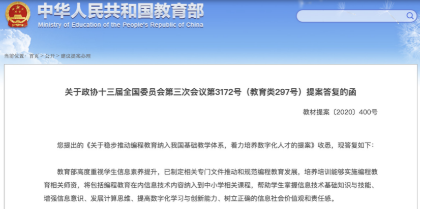 您提出的《关于稳步推动编程教育纳入我国基础教学体系,着力培养数字化人才的提案》收悉,现答复如下:
