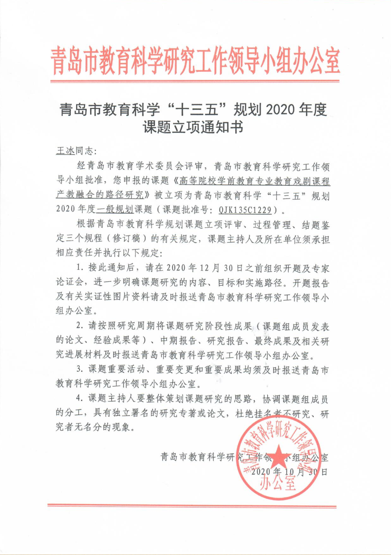 教育学院院长王冰青岛市十三五规划立项通知