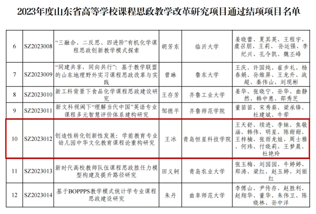 近日,我校专咨委副校级专家王冰教授主持的2023年山东省高等学校课程思政教学改革研究项目《创造性转化创新性发展:学前教育专业幼儿园中华文化教育课程论重构研究》,经山东省高等学校课程思政研究中心严格评审,顺利通过验收,成功结项!