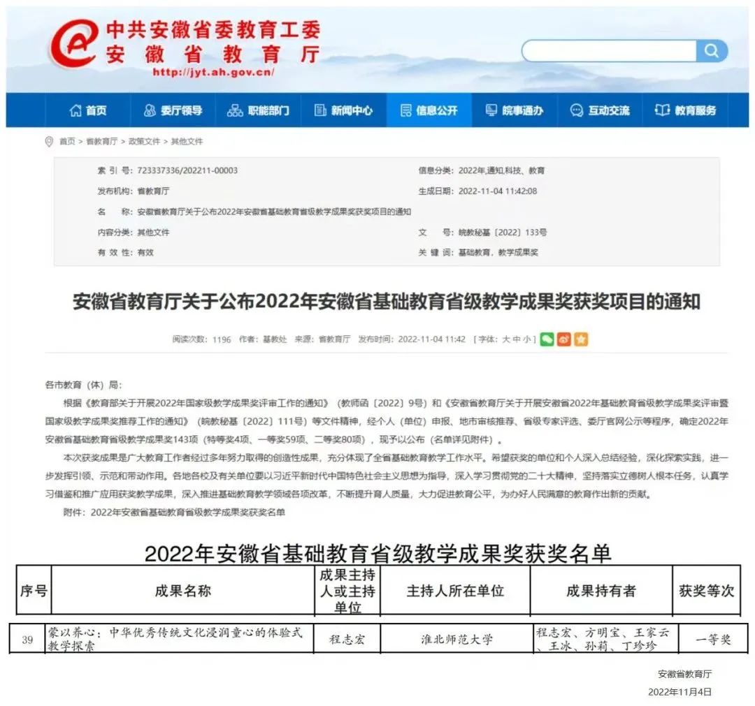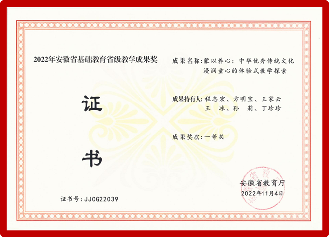 近日,教育学院院长王冰教授与淮北师范大学联合申报的“蒙以养心:中华优秀传统文化浸润童心的体验式教学探索”项目,获得安徽省2022年基础教育省级教学成果奖一等奖。安徽省该项共设奖143项,其中特等奖4项、一等奖59项、二等奖80项。