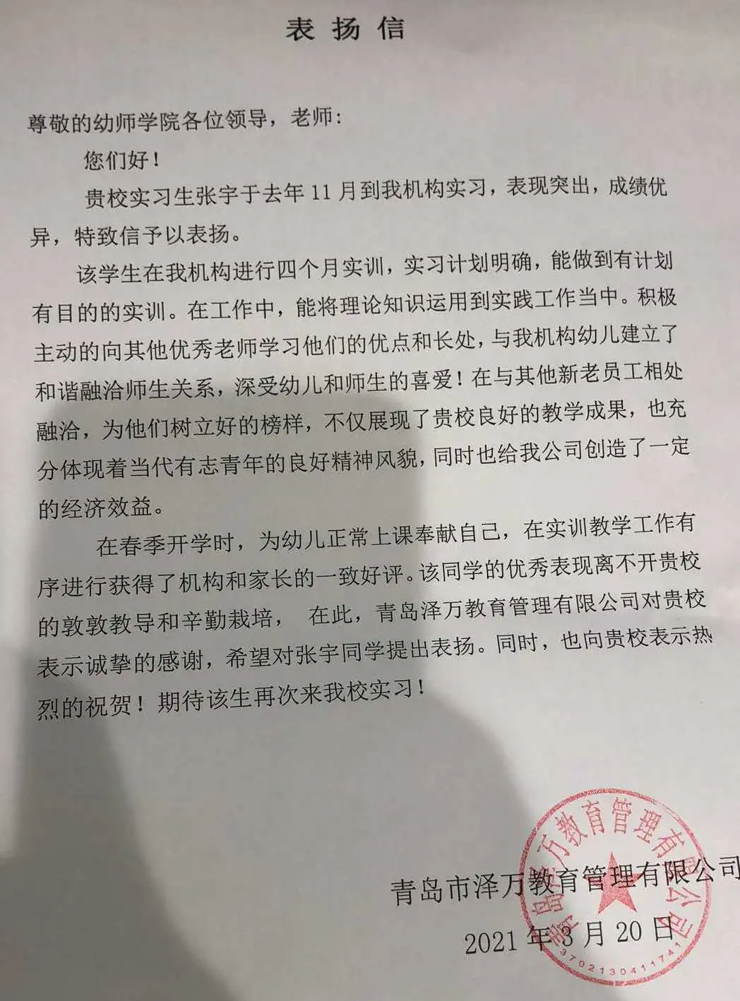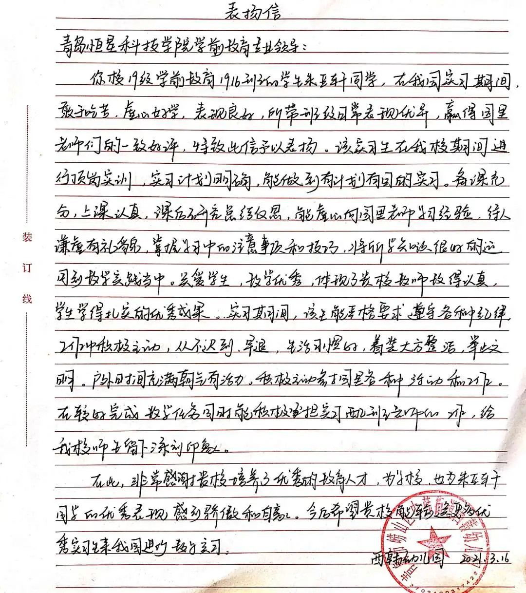 青岛恒星科技学院教育学院19级小可爱的实岗实训工作已经结束。我院学生在实岗实训过程中,对待工作认真负责。将在校期间所学的知识、技能熟练的应用到岗位上,展现了自己独有的风采,受到了实训岗位的一致好评!