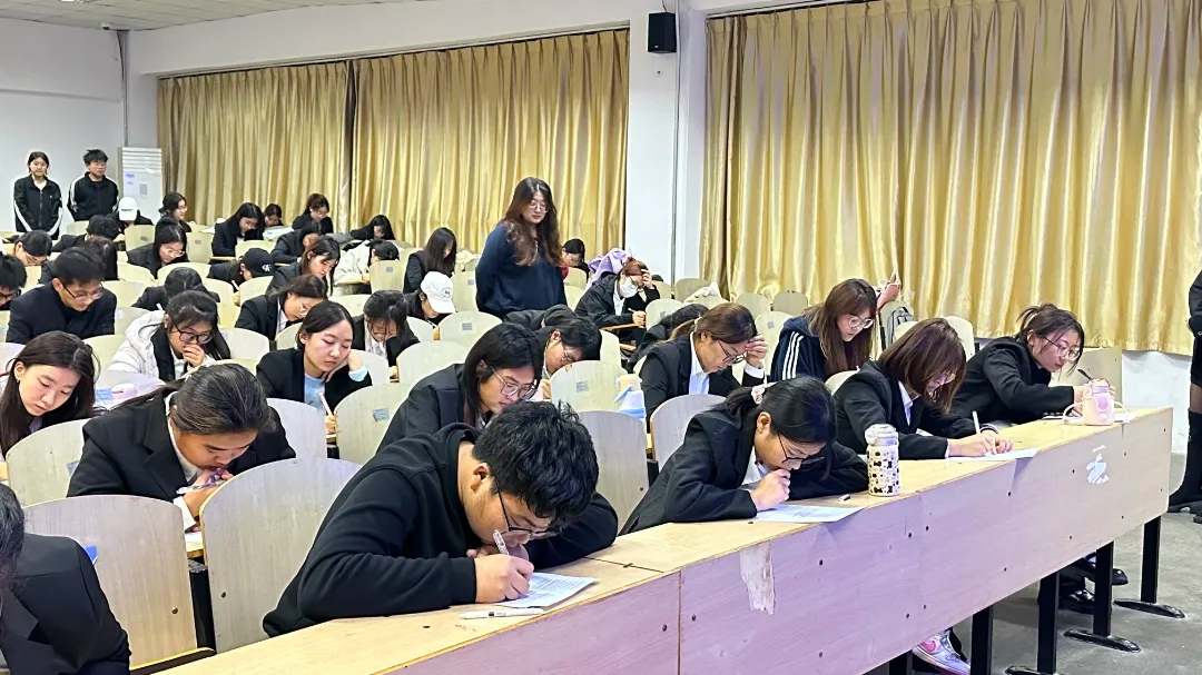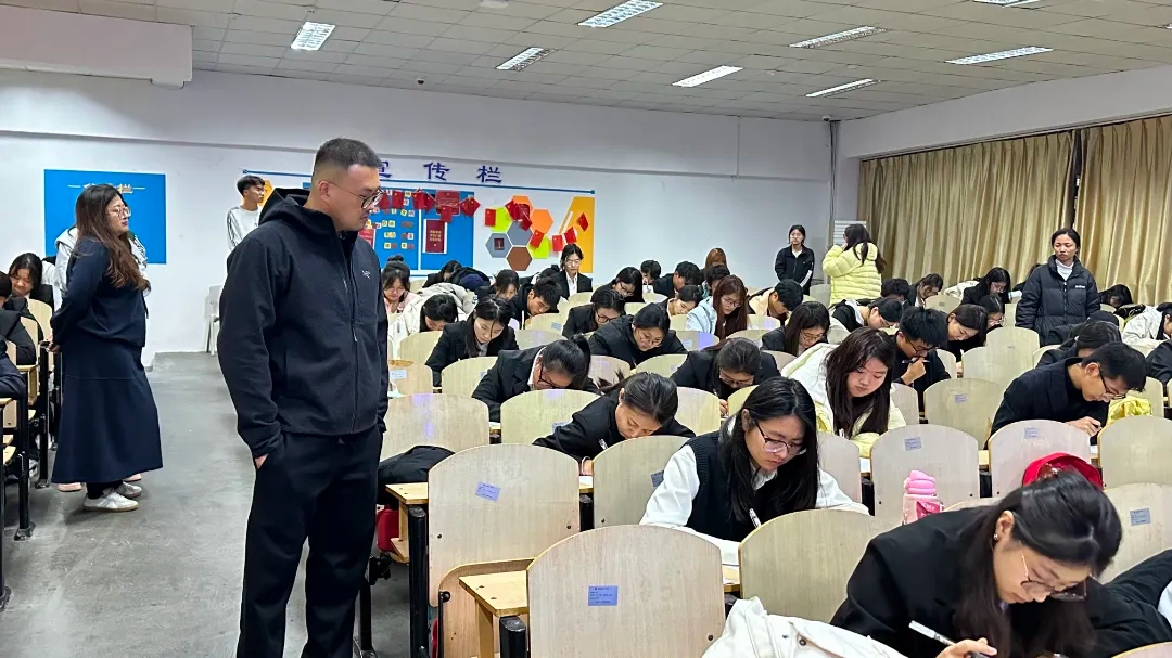 在随后举行的结业考试中,教室格外安静肃穆,学员们全神贯注地投入答题。整齐排列的课桌间,巡视老师轻缓的脚步声时远时近,整个考场秩序井然,充满着庄严而紧张的考试氛围。在此期间,校学生处隋立欣处长、副书记王柏杨书记及辅导员冯思源老师亲临现场巡视指导。他们的到来,体现了组织对入团积极分子培养工作的高度重视和对学员们成长的真切关怀,为整个结课环节增添了庄重与严肃的氛围。