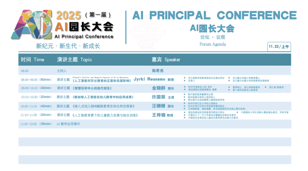 会议主题:启智未来——汇聚全球幼教智慧 会议时间:2025年11月21日至11月23日 会议地点:青岛恒星国际培训中心1F中华厅(山东省青岛市李沧区九水街道金水路66号)