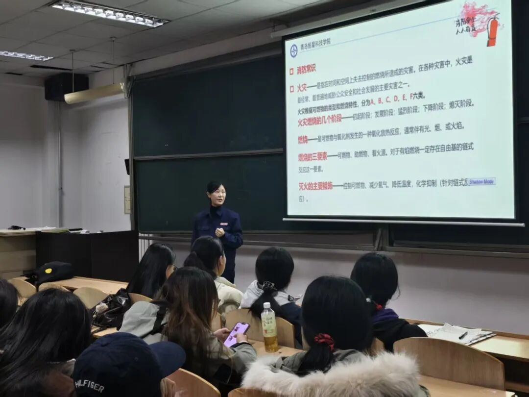 演练现场,从消防安全理论精讲到应急处置实操演示,每个环节都紧扣实战需求。专业教员通过案例分析、情景模拟等方式,系统讲解火灾风险辨识要点,现场演示灭火器"提拔握压"操作规范,组织疏散演练时特别强调"弯腰捂鼻、扶墙前行"的避险要领。同学们全神贯注观摩学习,在互动体验中掌握"发现火情-初期处置-安全撤离"的全流程应对技能,真正将"预防为主、防消结合"的安全理念转化为行动自觉。