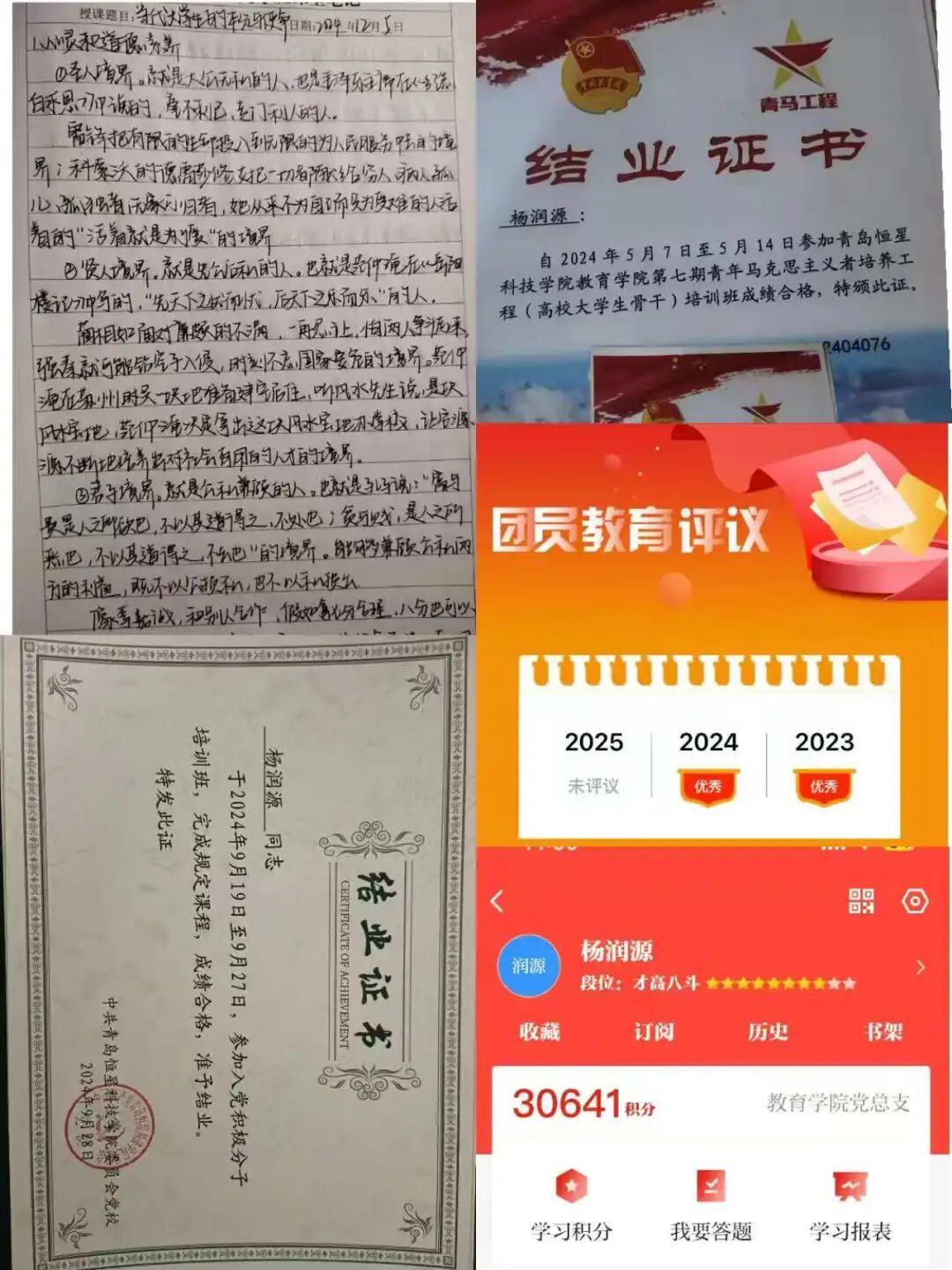 思想是行动的先导,杨润源始终将思想淬炼放在首位。他坚持强化理论学习,“学习强国”积分累计达30641分,在2023-2024年团员教育评议中连续两年获评“优秀”。为提升思想境界,他系统参与院级青马工程、校级青马工程、入党积极分子培训班等系列培训并顺利结业,以高标准严要求规范自身言行,在学业与实践中主动发挥带头作用,带动班级形成“笃学互助”的浓厚氛围,增强了班级凝聚力。