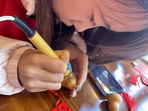 最让同学们着迷的莫过于烙画葫芦体验区。一个个形态各异的葫芦整齐排列,非遗传承人手持烙铁,在葫芦表面轻轻熨烫,深浅不一的烙痕逐渐勾勒出山水、花鸟、人物等精美图案,古朴而雅致。同学们怀着敬畏之心,接过烙铁,在传承人的指导下控制温度、掌握力度。从简单的线条勾勒到复杂的图案创作,每一步都考验着大家的专注力与创造力。当温热的烙铁与光滑的葫芦表面接触,独特的焦香弥漫开来,一幅属于自己的烙画葫芦作品也随之诞生。这不仅是一次技艺的体验,更是一次与传统匠心的对话,让同学们深刻感受到了非遗技艺“慢工出细活”的精髓。