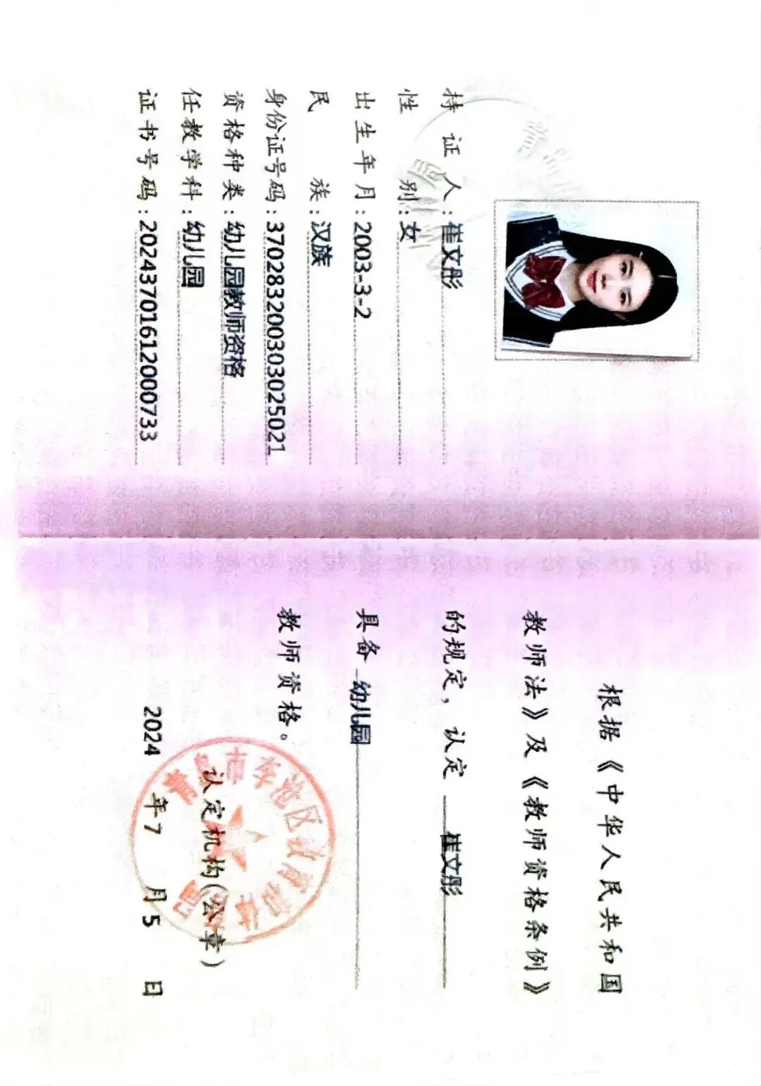 学前教育的真谛在于实践中的温度与陪伴。崔文彤的实习实践履历,写满了对教育事业的热爱:青岛合水路幼儿园的公办园实习经历,让她摸清了幼儿一日生活的组织逻辑;临沂市初心儿童之家的蒙台梭利教学实践,让她学会用尊重与引导守护孩子的天性;百合舞蹈学校的实习时光,则让她将艺术特长转化为启迪童心的教学力量。