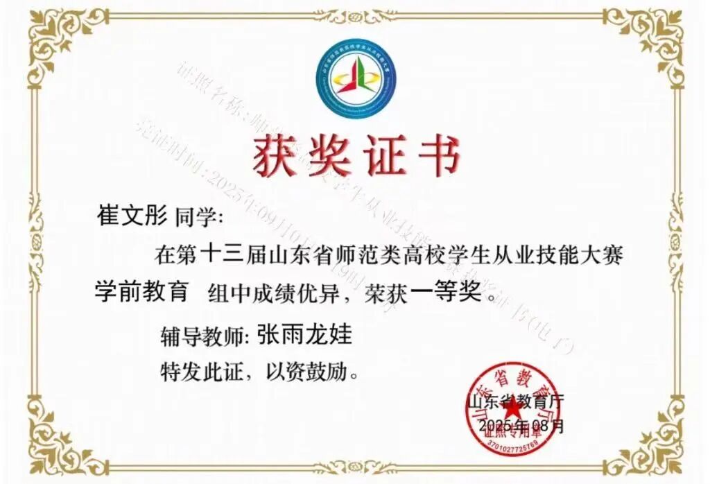 更令人瞩目的是她的"技能通关图鉴":幼儿园教师资格证、幼儿保育中级证书、中国舞蹈考级教师证,让她成为兼具专业素养与艺术特长的"全能型幼师储备军"。山东省优秀毕业生,山东省职业院校技能大赛等荣誉,正是对她学业态度的最佳佐证。